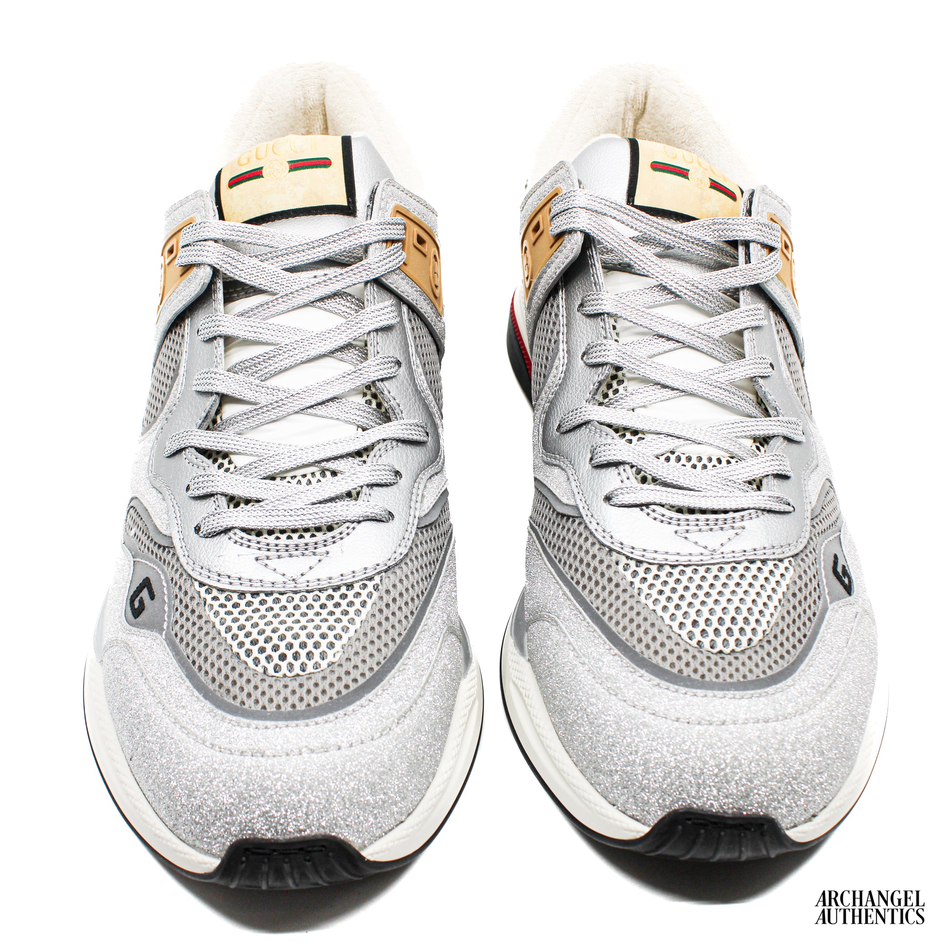 A futuristic running-inspired sneaker with a mixed-material upper in metallic silver and mesh, finished with signature Gucci branding for a bold, modern look.