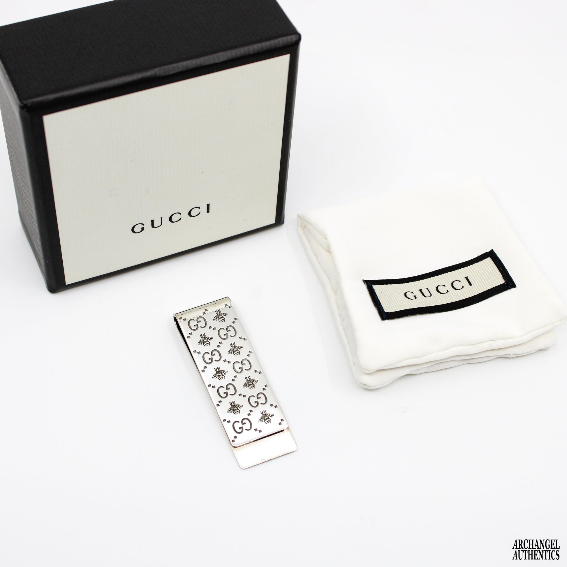 Elevate your style and keep your currency in place with the Gucci Interlocking Logo Bee Money Clip. Crafted from premium sterling silver, this exquisite accessory features the iconic interlocking G logo and a striking bee motif. Add a touch of luxury and sophistication to your everyday essentials with this statement money clip.