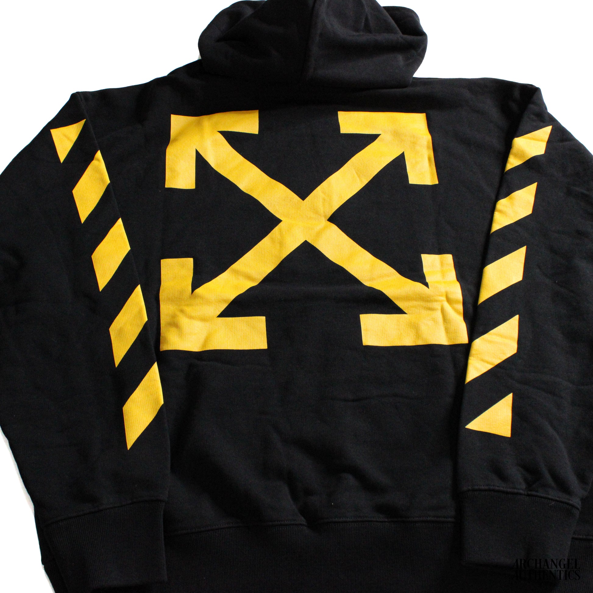 Featuring Off-White's signature diagonal arrow motif, this black-and-white hoodie combines streetwear and high fashion.